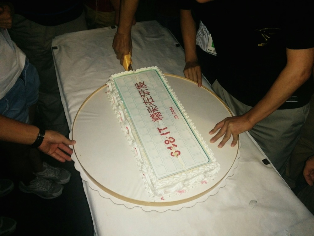 看到这个庆祝蛋糕的盒子没,那么大,没想到里面就这么大点,完全不够分,必须主动抢,我抢到了一块,哈哈!