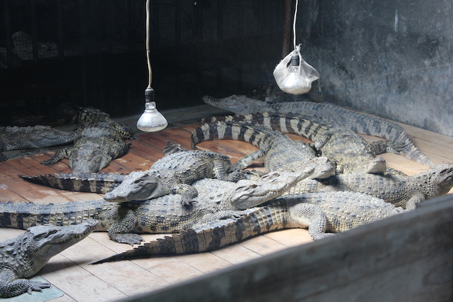 现在是鳄鱼的冬眠期,这里至少有上百只鳄鱼,关在一个个笼子里,一动不动地,张了嘴后都懒得合上。