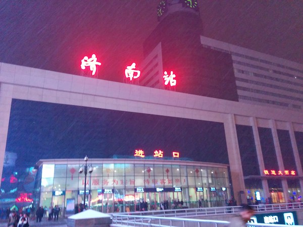 遇上了这一年来最大的雪,整个中东部都在下,T180 晚点1个小时才到济南,这里还下着雨夹雪,错过最晚去潍坊的火车,改去济南站左侧的客运站坐大巴。