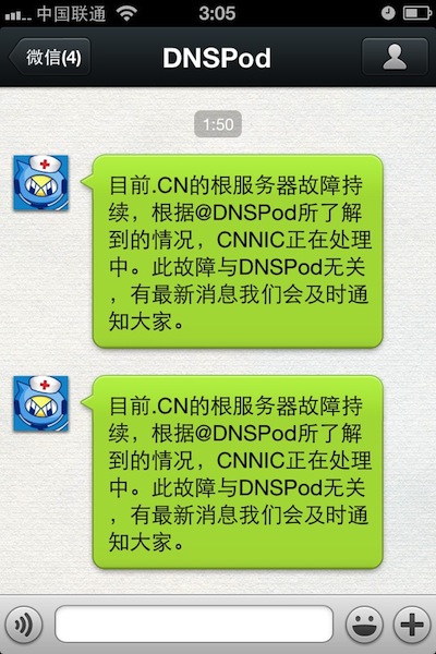 太震惊了,今天凌晨1点多,DNSPod 紧急通知,CN 的根域授权 DNS 全线故障,所有 CN 域名均无法解析。据新闻晨报配图,受影响的不仅是 .cn 域名,还包括 .com.cn 域名、政府机关、银行等域名大范围无法访问。我立马试着用手机访问 3.cn 和 z.cn ,偶尔由于缓存的 DNS 解析还可以访问,大多数是无法访问的。