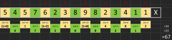 从右侧开始,偶数位数字都乘以2,如果结果是一个2位数字,则把这个两位数字相加,得到一个一位数字(这就叫数根,不可能出现19的情况),然后加在一起得到一个结果;然后我们把所有奇数位上的数字相加,又得到一个结果。把这两个结果再相加(煎蛋卡的结果是67),然后需要加上一个数字,使它能够被10整除,这里,我们需要加上·3·。