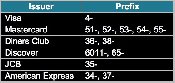 开头一些数字表示的是这张卡的类型,代表你是「威士」,还是「万事达」,或者是「美国运通」……表格左边是常见的信用卡品牌,右边是相应的数字前缀。(你可以拿出磁条刷毛的卡片对照一下)