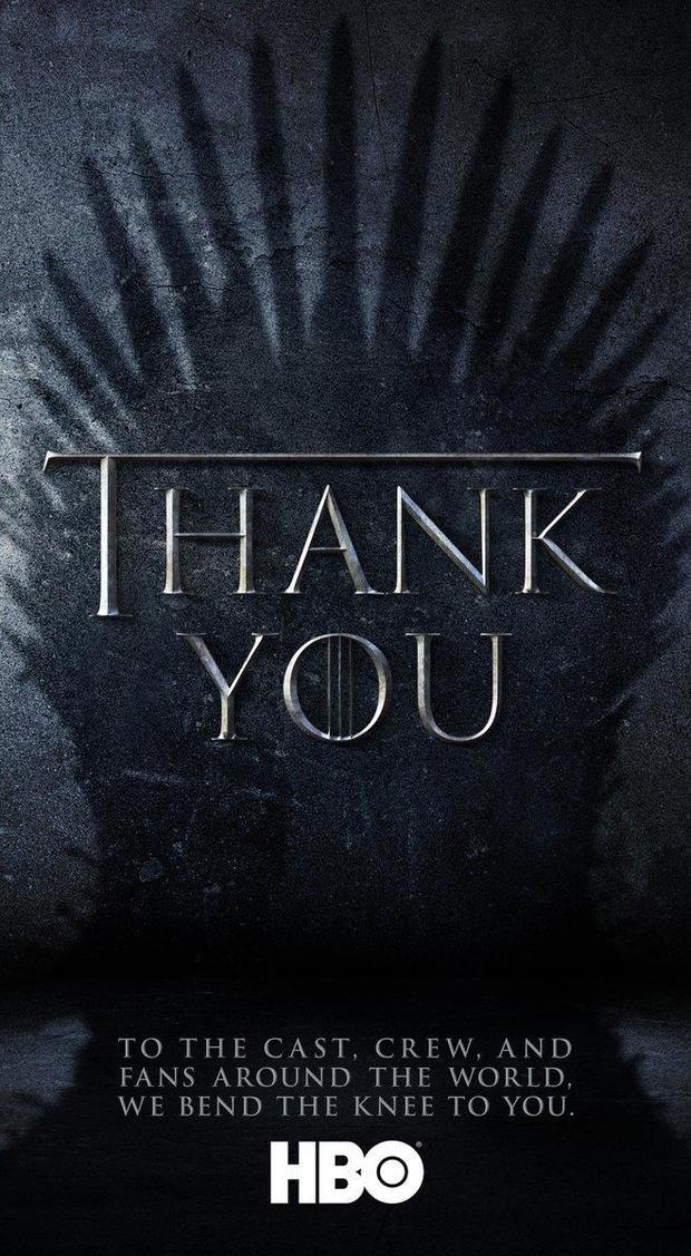 海报当中,铁王座上用经典“权游”字体写着:谢谢你们!下方的配词援引“龙妈”著名台词:“致演员们、剧组工作人员们、全世界的粉丝们,我们向你们跪了——HBO”。