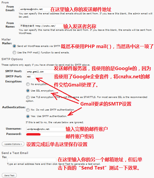 这里要说明一下的是,在上面的“Username”(用户名)一栏里,我因为使用的是Google企业应用套件,所以填的是 wordpress@cnzhx.net,实际上,你也可以配置使用你另外的,没有使用Google企业应用套件的Gmail邮箱来作为发送服务器。但不管怎么样,用户名必须写全,请参考插件作者提供的图片。