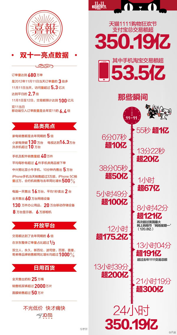 最后,回顾下天猫和京东,2013年11月11日的销售数据,真是喜人!不难预见,明年的双11,必然又是一次购物的狂欢节。