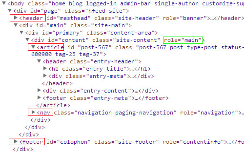 从图中可以看出,HTML5 的结构很清晰,头部、文章正文、底部、导航,都可以轻松定位到。