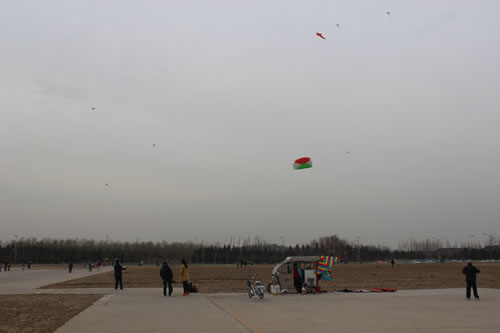 在科荟路和北辰西路交汇处的一大块空地上,离很远就能看到好多风筝,各式各样。